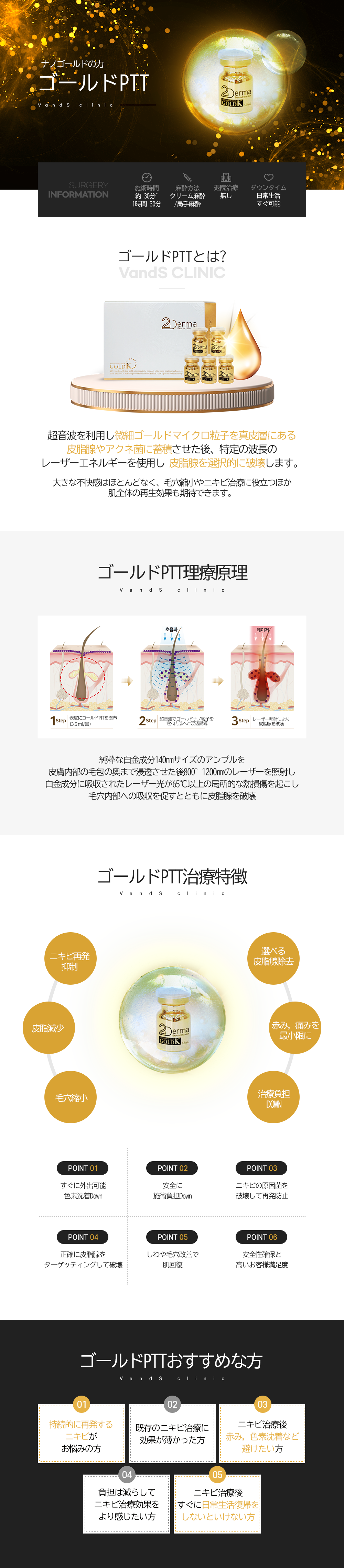 A. ゴールドPTTはゴールドマイクロ粒子を超音波を利用して毛穴の奥深くまで浸透させ、その後レーザーを照射した時に肌全体ではなくゴールドマイクロ粒子が入っている毛穴に反応して皮脂腺に選択的に作用するため、表皮への刺激が少ないという長所があります。
